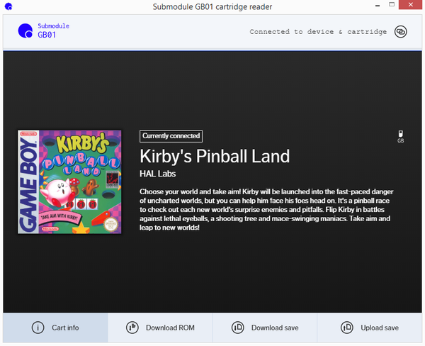 L’interface proposée est plutôt propre. Après branchement, le GB01 vous demande quel type de support vous souhaitez lire (famille Game Boy ou GBA), identifie la cartouche, vous propose une petite présentation du titre ainsi que les options de dump de rom/save ou d’upload de save. Pas de connexion internet obligatoire pour les dumps, sauf si vous souhaitez récupérer l’image du titre.