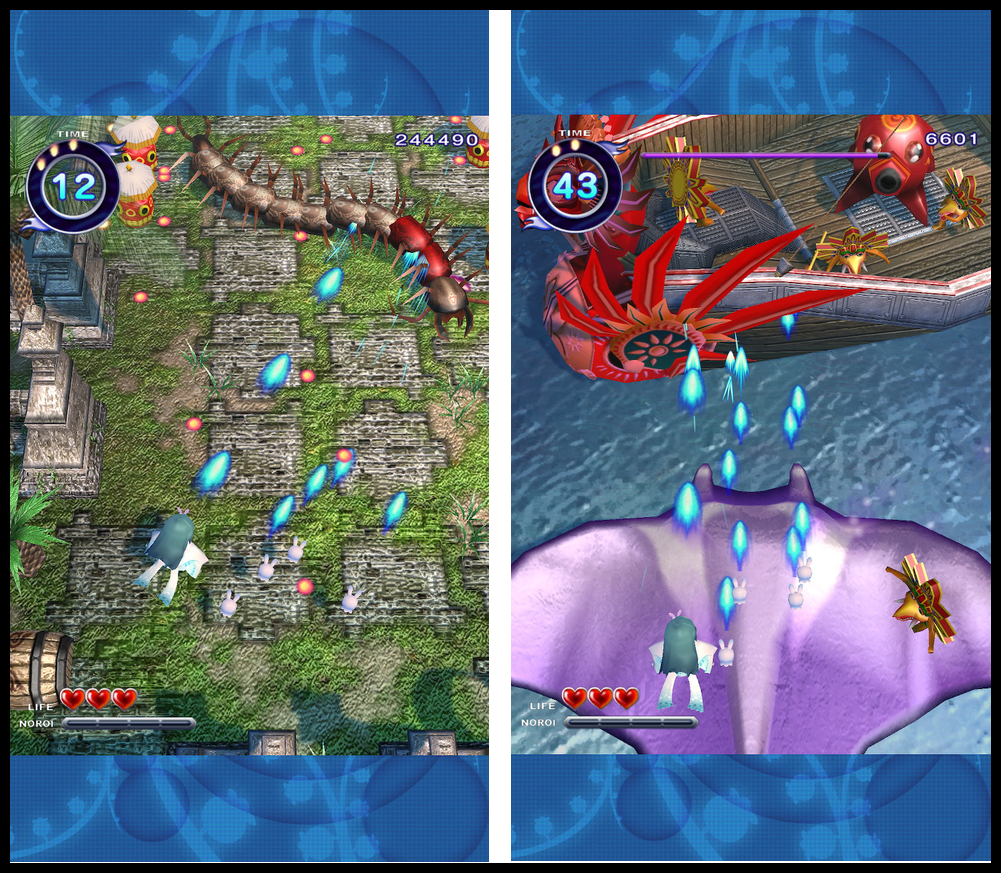 Derrière ses airs se rapprochant des cute’em up avec des personnages kawai et des couleurs pétantes, le jeu cache une mécanique plutôt intéressante : le « Curse Shot », sorte de malédiction que l’on balance pour affaiblir les ennemis, annuler certains projectiles ou créer des opportunités de scoring. C’est malin, ça demande du timing, et ça donne immédiatement une personnalité propre au jeu. A noter que le titre propose une maniabilité type twin stick et une autre un peu plus exigeante qui nécessite d’arrêter de tirer pour réorienter son tir. Les différents personnages proposés ont chacun leur particularité ce qui augmente quelque peu la replay value (outre le scoring bien évidemment).