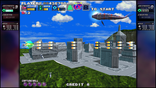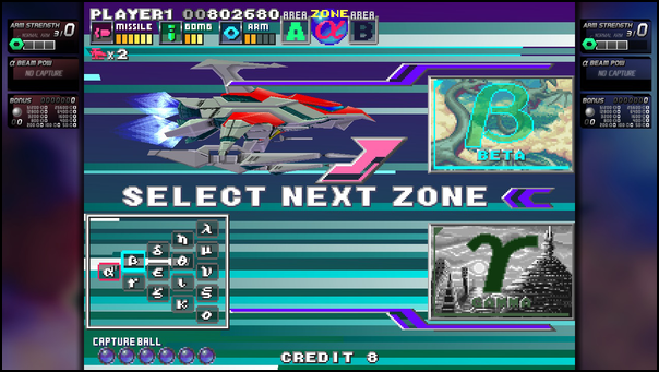 D’un point de vue gameplay, en dehors du classique tir/missile/bouclier que l’on peut améliorer via des orbes laissées par les ennemis déchus, le titre a la bonne idée de réemprunter une fonctionnalité apparu dans Darius Gaiden, à savoir la possibilité de capturer un ennemi et s’en servir comme satellite/bouclier voire le faire exploser pour se débarrasser des ennemis et projectiles. On appréciera également le petit coté Dragon Ball, lorsque votre super laser viendra se frotter au super laser ennemi et bénéficier de son énergie pour grandir en intensité, une jolie trouvaille.