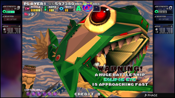 Si les ennemis et les décors bénéficient ici de la 3D, le gameplay reste définitivement ancré dans la 2D. Le design typique de la série est bien heureusement toujours présent (que serait un Darius sans ces énormes ennemis aux allures de dorade?) mais nous sommes ici face à un portage d’un titre de 1997 et de son « remaster » en HD (les deux versions sont disponibles). Si la version de 1997 n’a au final que peu d’intérêt, la version HD est celle qui nous intéressera plus particulièrement. C’est effectivement plus propre mais force est de constater que l’effet waouh de cette 3D que l’on pouvait ressentir à l’époque a fini pour s’émousser. Il y aura donc deux écoles, celles des nostalgiques de cette 3D low poly qui continueront à lui trouver un certain charme et ceux qui auront du mal à se remettre dans le contexte de l’époque pour apprécier le titre, du moins pour son coté visuel.