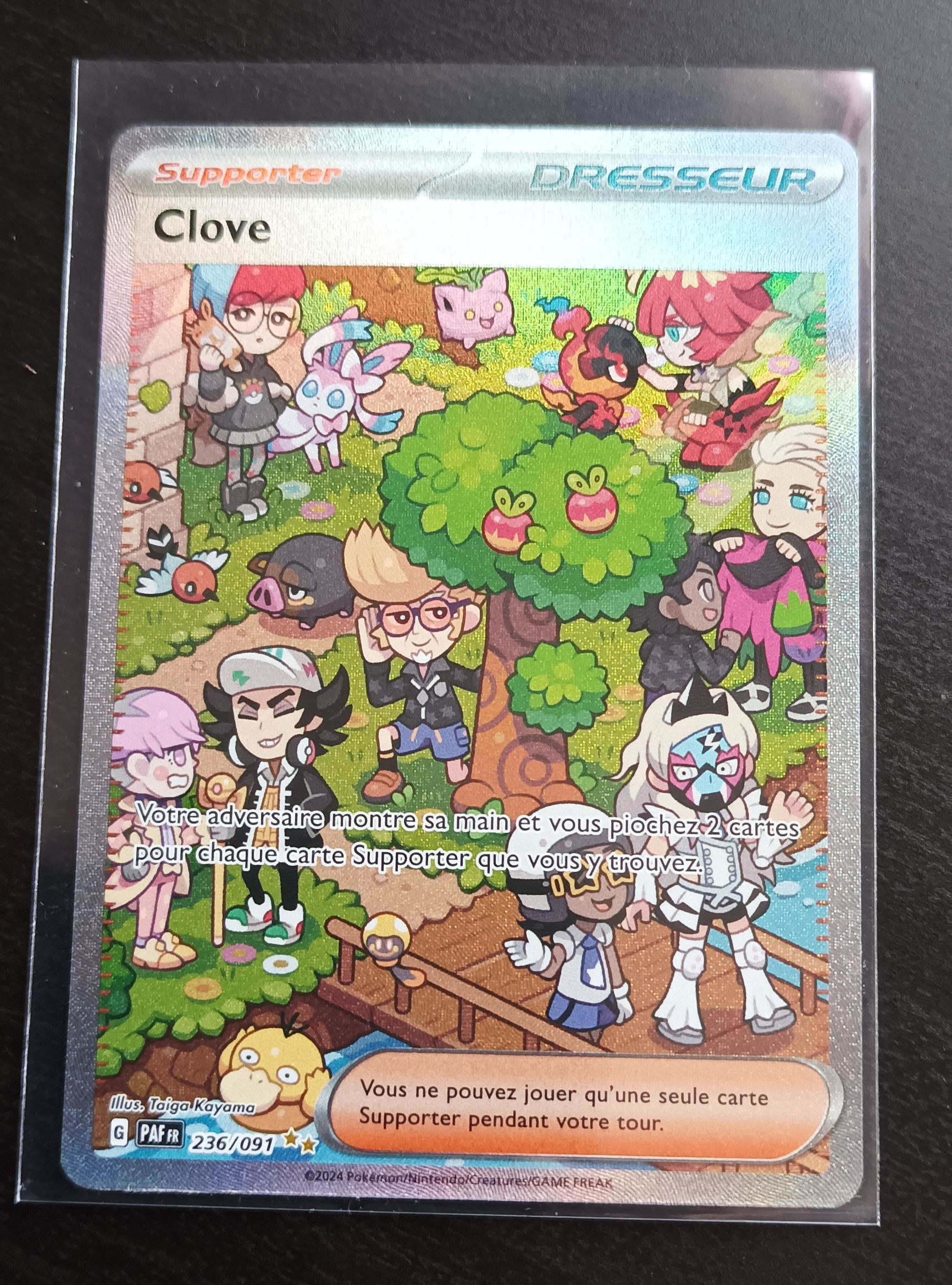 La carte du jour est celle de Clove, une carte vraiment très sympa où l’on retrouve un grand nombre de Pokémon dont notre canard préféré en train de faire trempette. Peu d ecartes de ce dresseur, peu de cartes de cet illustrateur, une carte intéressante à posséder.