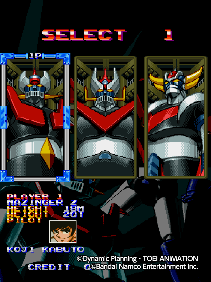 MAZINGER Z est un shmup publié par BANPRESTO en 1994 en arcade. Vous pourrez prendre le contrôle de Mazinger Z, Great Mazinger et Grendizer, et utiliserez toute la panoplie d’armes à votre disposition pour affronter l’empire souterrain du Dr Hell ! Le titre permet le jeu à deux.
