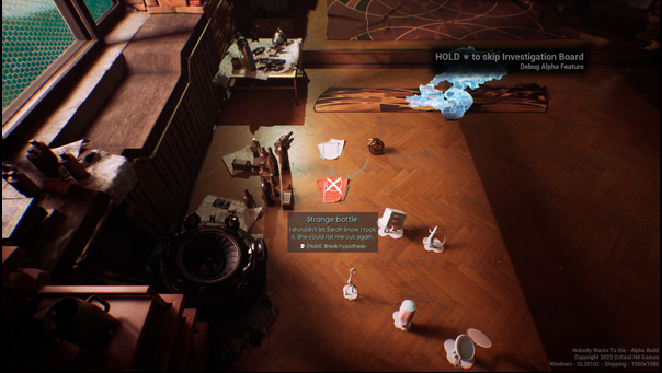 La vidéo (limite d’âge requise) présente notamment les méthodes d’enquête caractéristiques du titre en mettant en évidence les mécanismes que les joueurs pourront utiliser pour collecter des preuves et analyser les indices. La première scène de crime de Nobody Wants to Die met en avant certains des nombreux outils d’investigation à utiliser comme une lampe UV analysant les éclaboussures de sang, une radio de poche permettant d’examiner le sol et des techniques de manipulation du temps.