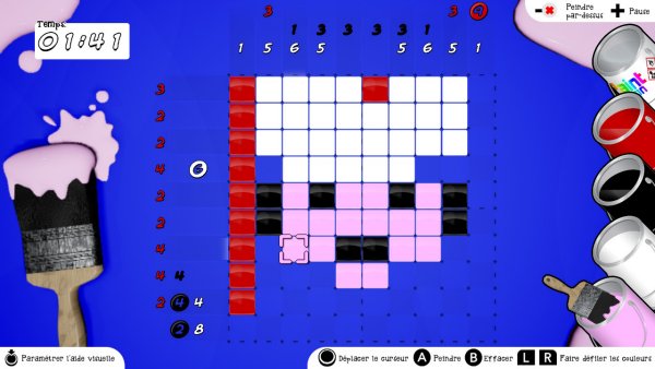 Sur un principe proche de Picross, vous devez utiliser les chiffres situés sur les cotés du puzzle pour déterminer le nombre de blocs devant être peints à l’aide d’une couleur spécifique. L’ordre des chiffres ne déterminant pas l’ordre des couleurs, vous devrez faire preuve de réflexion pour résoudre les puzzles. Heureusement une indication supplémentaire va permettre de vous en sortir. Si le chiffre est entouré, les cases à peindre sont consécutives. Dans le cas contraire les cases sont réparties aléatoirement sur la ligne (ou colonne).